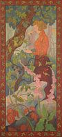 Digitales, Paul Ranson (1899) Een vrouw staat in het bos, omringd door planten en bomen. Het hoge, verticaal opgestelde doek is gemaakt in een uiterst decoratieve compositie die de kenmerken van de Nabis schilder Ranson volledig weergeeft. De vier zijden van het doek worden omlijst door decoratieve randen die doen denken aan wandtapijten, en men kan zich voorstellen dat dit schilderij oorspronkelijk een voorbereidend werk was voor een wandtapijtproject.