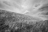 Dijk bij Petten in Noord-Holland op een winderige en bewolkte dag in zwart-wit. Herfstig en leeg. De eindeloze ruimte. Het Nederlands landschap zoals we dat graag zien.