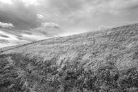 Dijk bij Petten in Noord-Holland op een winderige en bewolkte dag in zwart-wit. Herfstig en leeg. De eindeloze ruimte. Het Nederlands landschap zoals we dat graag zien.