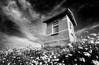 Huisje, dijk, stenen, bloemen, kust, bewolkte lucht, hoog contrast, architectuurfoto, architectuurfotografie, zwart-wit foto, zwart-wit fotografie, horizontaal beeld, natuur, landschapfoto, nederland, Rob Blok Photo