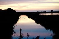 Zeedijk op Tholen vlakbij Scherpenisse. De zon gaat onder. De hemel en het water vullen zich met dezelfde kleuren, spiegeling...