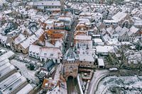 Dijkpoort Hattem bij de ingang van het oude centrum luchtfoto tijdens een koude winterochtend met sneeuw op de daken van bovenaf gezien. De stad Hattem grenst aan de ene kant aan de bossen van 'De Veluwe' en ligt aan de andere kant aan de rivier de IJssel.