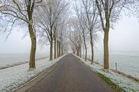 Weg over de Zwartendijk in het buitengebied van Kampen omgeven door een mistig landschap met rijk op de bomen en velden tijdens een koude en mistige winterochtend.