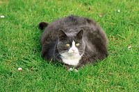 Prachtige opname van een lekkere dikke kat op het gras in de tuin in de lente, wie wil dat nou niet aan de muur!