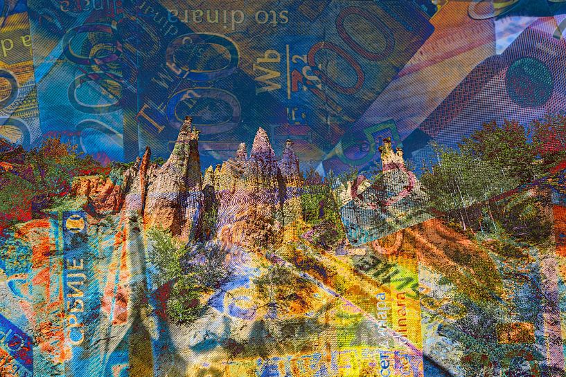 Fascinerende dubbele belichting waarin de bizarre rotsformaties van de Servische "Duivelsstad" samensmelten met de artistieke afbeeldingen van de bankbiljetten van de Servische dinar. Het werk combineert de ruige standvastigheid van de natuur met het culturele en economische erfgoed van het land. Een levendig samenspel van aardse…