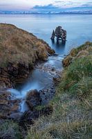 Deze hele aparte rots (Hvitserkur) in de vorm van een dinosaurus (of iets anders wat je er in kunt zien) staat voor de kust in het noorden van IJsland. Er is gekozen voor een lange sluitertijd om de zee een wollig karakter te geven en iets van een reflectie van de rots te zien. Op de voorgrond een kleine rivier die langs de afgrond naar beneden valt naar de zee.