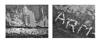 Tweeluik van roestfoto's uit een haven. Op de linkse foto een detail van een roestige buis en op de rechtse foto een aanduiding van een havenplaats ARM. Het is in zwart-wit. Bijzonder is de structuur van beide foto's. Het ligt er als het ware bovenop.