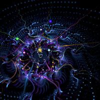 Dit werk toont een abstracte, dynamische compositie van wervelende lichtpatronen in violet, blauw, groen en geel. De lichtgevende elementen zijn verbonden door fijne lijnen en stippen, waardoor een ritmische beweging en een gevoel van energie ontstaat. De donkere achtergrond versterkt de helderheid van de kleuren en zorgt ervoor dat de vormen lijken te zweven in een ruimte van licht.
