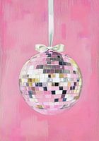 Olieverfschilderij van een roze discobal met zilveren lint hangend aan de muur, roze achtergrond, eenvoudige vormen, eenvoudige lijnen, minimalistische stijl, zachte tinten, glitter en paillettenreflecties in olieverf