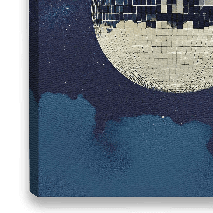 Een zilveren discobal hangt in de lucht en reflecteert sterren en wolken. De discobal is groot en heeft reflecterende oppervlakken die het sterrenlicht weerkaatsen. Ervoor is een lege ruimte voor tekst of afbeeldingen. Deze scène roept herinneringen op aan retro-avonden, zoals dansen in nachtclubs uit de jaren 70 en vinylplaten met…