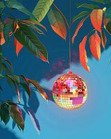 De achtergrond wordt gevormd door grote bladeren van een tropische plant, die prachtig verlicht zijn door het warme, rode licht dat op hen schijnt. De bladeren, met hun gedetailleerde nerven en realistische texturen, contrasteren scherp met de geometrische en reflecterende oppervlakken van de discobal. De blauwe achtergrond voegt een serene en kalmerende dimensie toe aan het geheel, waardoor een balans ontstaat tussen energie en rust.