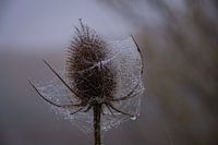 Afgelopen week keek ik 's morgens uit mijn raam en wist ik dat ik er op uit moest gaan om foto's te maken. Ik reed net na de middag met mijn scootmobiel naar de Broekpolder in Vlaardingen. Daar was het prachtig met mist die niet meer al het zicht belemmerde. De Distels langs het water hadden van een afstand een wit laagje. Ik besloot dit van dichterbij te gaan bekijken. Wat geweldig! De spin had allerlei draden gesponnen en zat op de top van de Distel te wachten op een lekkernij. De draden waren prachtig versierd met allemaal hele kleine druppels door de mist. Dat was dus het witte dekentje dat ik van een afstand had gezien. Een mooi schouwspel met op de achtergrond nog duidelijk de witte mist. Een macrolens had ik niet bij mij, toch lukte het goed om het mooi vast te leggen. Zelfs de spin is zichtbaar!