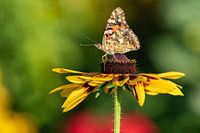 Kleurrijke opname van een distaffel op een zonnebloem, prachtig belicht tegen een vage achtergrond.