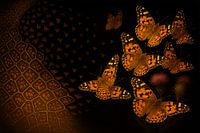 Een groep distelvlinders (Vanessa cardui) vliegt sierlijk uit een geometrisch patroon dat langzaam oplost in de duisternis.
