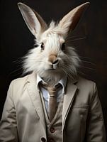 "Distinguished Elegance" is een intrigerende portretfoto die de lijn tussen realiteit en fantasie doet vervagen. Deze afbeelding toont een konijn in de gedaante van een heer, gekleed in een net beige pak met een bijpassende das. De foto is met een vleugje surrealisme genomen tegen een donkere achtergrond, wat het onderwerp naar voren brengt en zorgt voor een indrukwekkend contrast. De aandacht voor detail is zichtbaar in de textuur van het pak en de natuurlijke uitstraling van de konijnenvacht, waardoor de kijker wordt uitgenodigd om de realiteit vanuit een ander perspectief te beschouwen. Dit kunstwerk zou een speelse, doch stijlvolle toevoeging zijn aan elke ruimte die verrijkt is met moderne kunst en een vleugje humor.