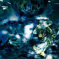 Van wie deze wereld is, daar gaat het hier natuurlijk om. Is dit de wereld van de libelle of die van de vis, of misschien van allebei. Hoewel allebei dat kan niet. De libelle leeft op het water en de vis leeft ín het water, dat is toch echt wel een wezenlijk verschil. Ze kunnen niet leven in elkaars wereld. Welke wereld dit is dat maakt u natuurlijk uit. Er valt in ieder geval mooi licht op de ondergrond. Dus de zon schijnt door iets heen, misschien wel door een bladerdek en laat daardoor die lichte plekken op de ondergrond zien. Dit zegt uiteraard nog niks over het feit of dit boven of onder water is. De ronde vorm boven in het beeld, kan een deel van een vis zijn, maar het kan evengoed een vaas of een schelp zijn. Ook dat is aan om dit uit te maken. Kortom er is genoeg te zien op dit kunstwerk en vooral veel vragen om te beantwoorden. De kleuren van dit surrealistische, abstracte werk zijn blauw, cyaan, geel, crème en zwart.