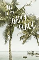 Heerlijk rustig strandleven. Het verlaten tafereel nodigt uit tot ontspanning. Paradijselijk uitzicht door de palmbomen op de oceaan en een kleine aanlegsteiger. Een ontwerp dat past bij het motto van het leven. Dit is mijn gelukkige plaats. Het leven is mooi. Maak het jezelf gemakkelijk waar je wilt!