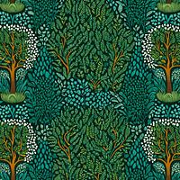 Dit ontwerp is een boeiende, gestileerde weergave van een dicht bos of tuindoolhof. Het ingewikkelde patroon wordt gedomineerd door diepe groentinten en roept een gevoel van diepte en mysterie op.