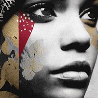 Een zwart-wit portret met grafische patronen, bloemen en texturen over het gezicht van een vrouw – een mix van fotografie en digitale kunst.