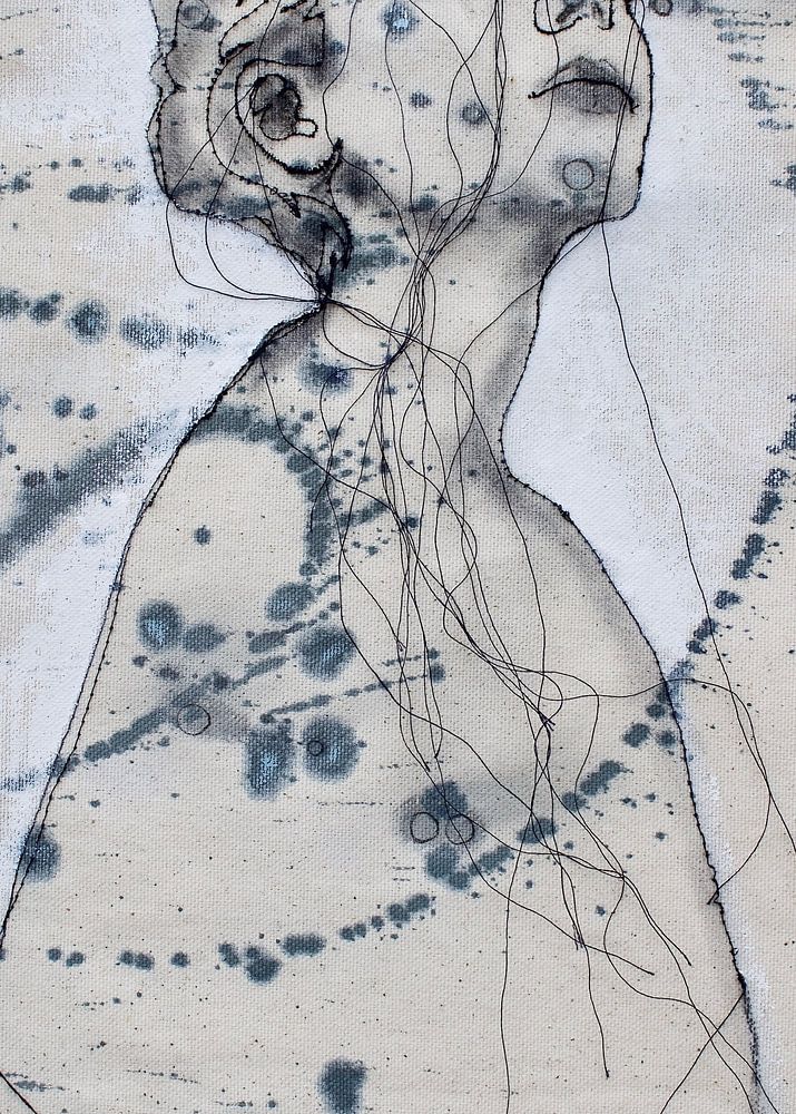 Een figuratief abstract werk van zwart draad, houtskool & acryl op doek.