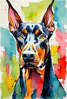 Een aquarel van een doberman laat de gespierde bouw, de gladde vacht en de trotse houding van het ras zien. De levendige maar toch zachte kleurspoelingen brengen de alerte, zelfverzekerde uitdrukking en opvallende kenmerken van de doberman naar voren, zoals zijn scherpe oren en intense ogen. De vloeiende penseelstreken brengen zowel kracht als elegantie over en benadrukken het nobele en beschermende karakter van de doberman op een dynamische en artistieke manier.