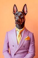 Een majestueuze Doberman in een elegant paars pak straalt charisma en stijl uit. Zijn goed geproportioneerde, rechtopstaande oren en intense, doordringende uitstraling geven hem een autoritaire uitstraling. Gewikkeld in een felgele sjaal brengt hij een vleugje speelsheid in zijn elegante verschijning - een echte showstopper.