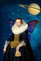 Jonge vrouw in een prachtig gewaad geknipt uit een oud schilderij en gecombineerd met vlindervleugels, staat tegen de achtergrond van een blauwe gloeiende ruimte-uitsnede waarin Saturnus duidelijk zichtbaar is.