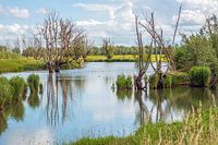 Dode boomtakken weerspiegeld in het gladde wateroppervlak van een kreek in het Nederlandse Nationaal Park de Biesbosch bij het dorp Werkendam in de provincie Noord-Brabant.