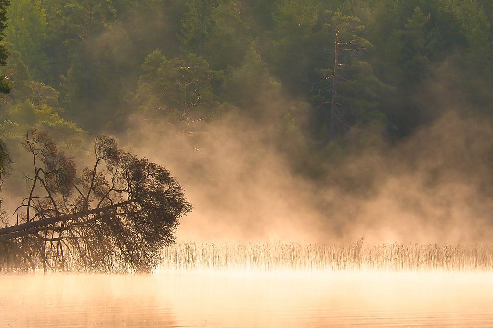 Mist boven een meer in Zweden. Dode boom steekt uit in het water bij zonsopgang. Scandinavische natuur