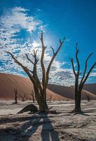 Dode boom met tegenlicht in Dode vallei, Namibië.