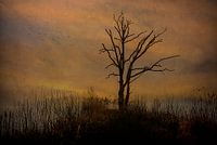 Brabants landschap met een dode boom tegen een achtergrond van een wolkenlucht en een zwerm vogels.