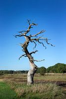 Dode solitaire boomstam in natuurgebied. Blauwe lucht. Nationaal Park Balloerveld Drenthe Nederland. Stroomgebied Drentse Aa.