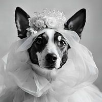Een schattige hond poseert in een elegant wit bruidsjurkje, rijkelijk versierd met fijne kant en delicate details. Op het hoofd draagt de hond een kleine sluier, die zijn charmante en bijna komische uitstraling versterkt. De zachte, neutrale achtergrond brengt de focus volledig op de sierlijke outfit en de ontspannen houding van de hond. Het geheel straalt een speelse combinatie van elegantie en schattigheid uit.