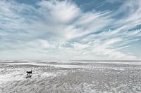 De foto toont een hond in de uitgestrektheid van de Waddenzee. Het beeld is bewerkt in high-key stijl.