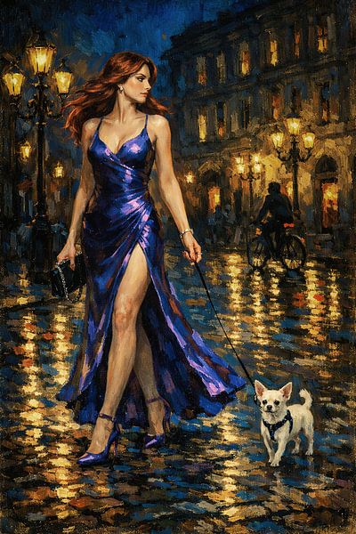 Het schilderij toont een elegante, roodharige vrouw die zelfverzekerd over een natte stadsstraat loopt. Ze draagt een nauwsluitende, dieppaarse satijnen avondjurk met een hoge split en bijpassende paarse pumps. In plaats van op een modieuze 'catwalk' te lopen, is ze op een 'dogwalk': ze houdt een dunne lijn vast waaraan een klein,…