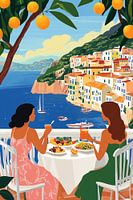 Een sfeervolle illustratie van twee personen die genieten van een lunch op een zonovergoten terras aan de Italiaanse kust. Het kleurrijke tafereel toont een typisch mediterraan kustdorpje met pastelkleurige huizen tegen de bergwand, terwijl sinaasappelbomen het terras omlijsten. Op de voorgrond staat een gedekte tafel met verse gerechten en verfrissende drankjes, terwijl in de azuurblauwe baai enkele zeilboten dobberen.