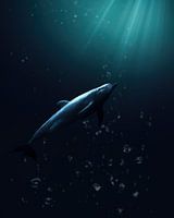 Dit is een samengesteld werk van een dolfijn die zwemt in de zee, met lichtstralen die van bovenaf het water naar binnen vallen en op de dolfijn schijnen. De dolfijn is omringd met bubbeltjes.