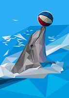 Dolfijn en de bal Low Poly Art in abstracte illustratiestijl. Dolfijn houdt de bal met mond neus in abstract blauw water achtergrond.