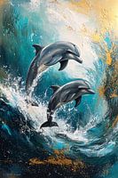 Dit prachtige ontwerp toont twee speelse dolfijnen die sierlijk uit het water springen, omgeven door een woeste oceaan vol dynamiek en kleuren. Het gebruik van levendige tinten blauw, goud en wit zorgt voor een energieke en indrukwekkende uitstraling die perfect past in een moderne woonruimte of kantoor. De gedetailleerde penseelstreken…