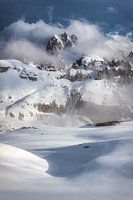 Wolken omringen de Cadini-groep, die heel goed te zien is vanaf de parkeerplaats Dreizinnen Hütte. Hier in de absolute sneeuwjacht.