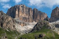 Een kabelbaan gaat in de zomer met toeristen omhoog naar de top van het indrukwekkende Sella massief in de Dolomieten in Zuid-Tirol, Italië.