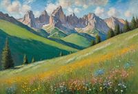 Frisgroene weiden bezaaid met bloesems strekken zich uit in de richting van de Dolomieten, waarvan de toppen nog sporen van sneeuw dragen. De heldere voorjaarszon baadt het tafereel in een vrolijk licht, terwijl de impressionistische toets van de kunstenaar hemel, berg en veld vermengt tot één harmonieuze visie van vernieuwing.