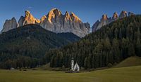 De beroemde St. Johann kerk (of San Giovanni) met de machtige Geisler Dolomieten groep op de achtergrond. Het kerkje ligt in St. Magdalena (Val di Funes), in Zuid-Tirol, Italië.