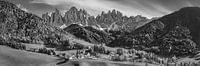 Alpenpanorama rond het dorp Villnöss en zijn kerk en de bergen van de Geislergroep in zwart-wit ( monocroom ) 90310285ays