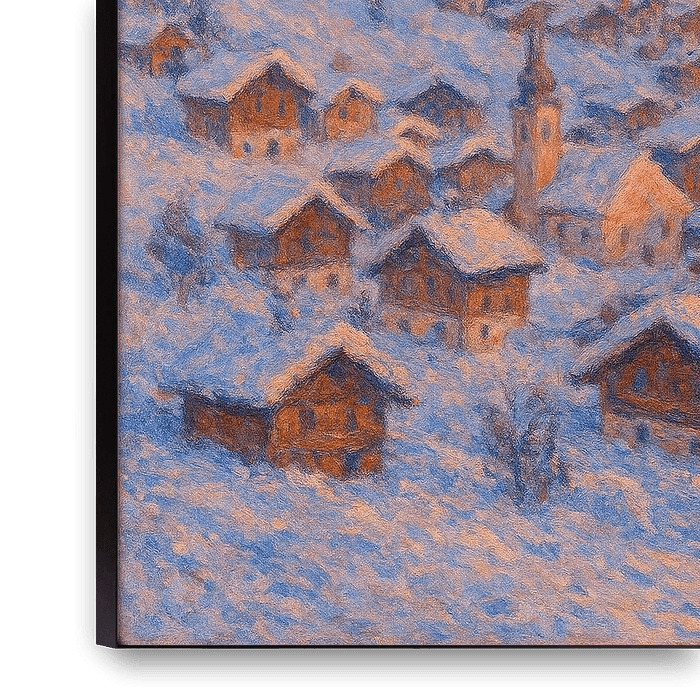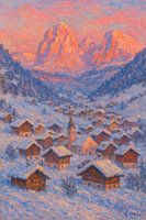 Deze fine art print "Ortisei Sunset Glow" vangt het laatste warme licht van de dag in het Dolomieten dorp Ortisei, weergegeven in een stijl geïnspireerd door de meester van licht en sfeer, Claude Monet. Stel je de met sneeuw bedekte daken en de grillige pieken van de Dolomieten voor, badend in roze, violet, amber en goud; de gloed van…