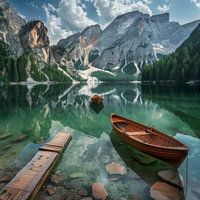 Deze adembenemende foto toont een helder bergmeer in de Dolomieten, omringd door majestueuze bergen en weelderige bossen. De twee traditionele houten boten op de voorgrond en het kristalheldere water creëren een kalme en idyllische sfeer. Dit kunstwerk is perfect voor liefhebbers van natuur, bergen en landschapsfotografie en brengt de…