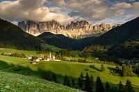 Een prachtig plekje in de Dolomieten met uitzicht op het Odler gebergte. De zon verlicht het dal vlak voor zonsondergang.