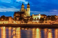 Uitzicht over de Elbe naar de Dom van Magdeburg en de Fürstenwall in de oude stad Magdeburg bij nacht, Saksen-Anhalt, Duitsland.