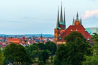 De foto toont een panoramisch uitzicht op de oude binnenstad van Erfurt met in het midden het opvallende ensemble van de Erfurtse kathedraal en de Severikerk. De gotische torens steken boven de daken van de stad uit en karakteriseren het silhouet. Op de voorgrond omlijsten groene boomtoppen het motief, terwijl het stadslandschap zich op…