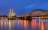 Een beroemd uitzicht over Keulen; met de Hohenzollern spoorbrug over de Rijn rivier op de voorgrond en de Dom van Keulen op de achtergrond.